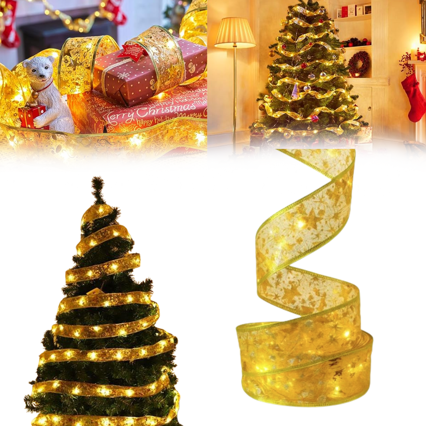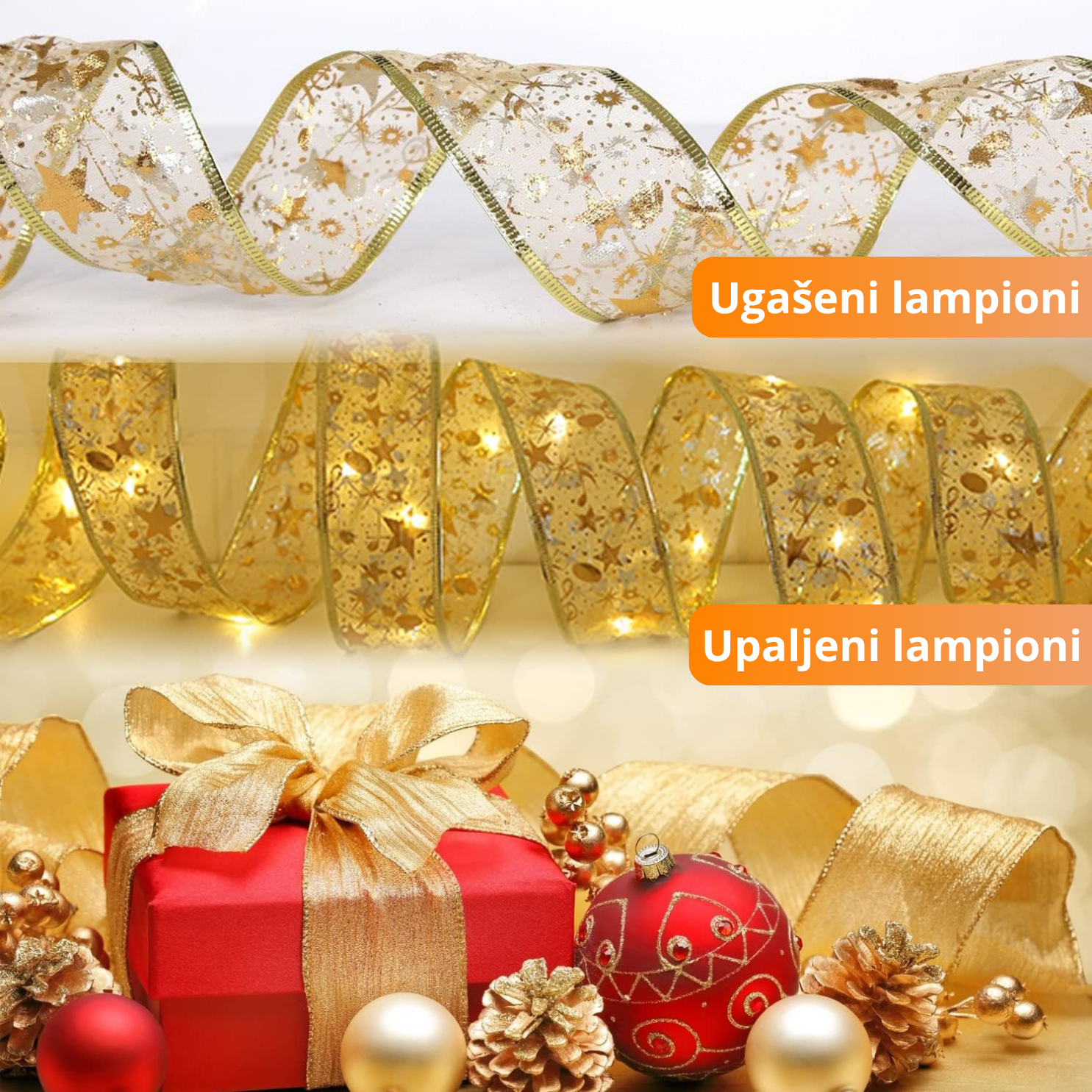 - Materijal: dekorativna traka sa žičanim ivicama i zlatnim prazničnim motivima.